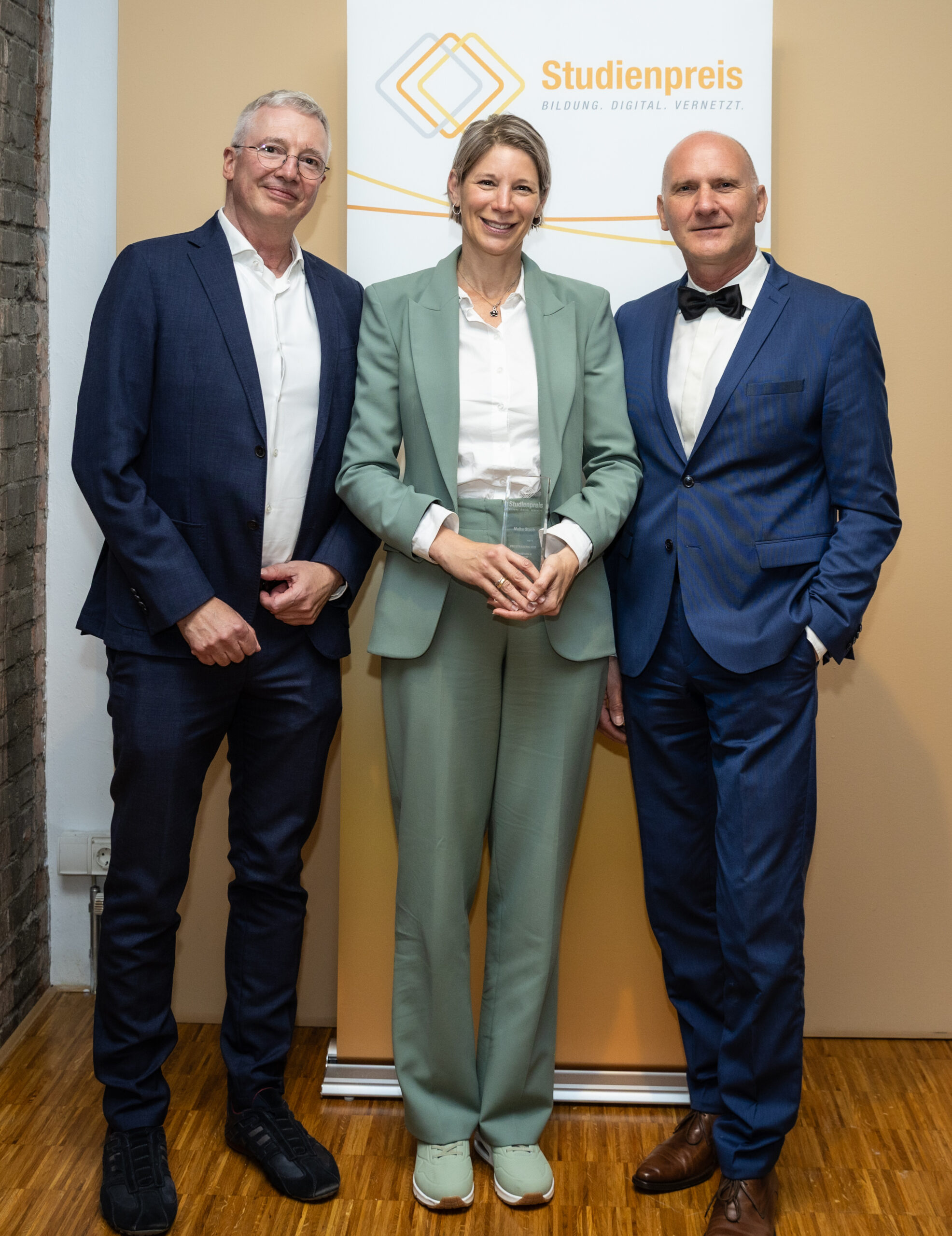 Preisträgerin Meike Stach zusammen mit Andreas Vollmer, Präsident des Bundesverbandes der Fernstudienanbieter (li.), und Laudator Prof. Dr. Ralf Isenmann von der Wilhelm Büchner Hochschule.