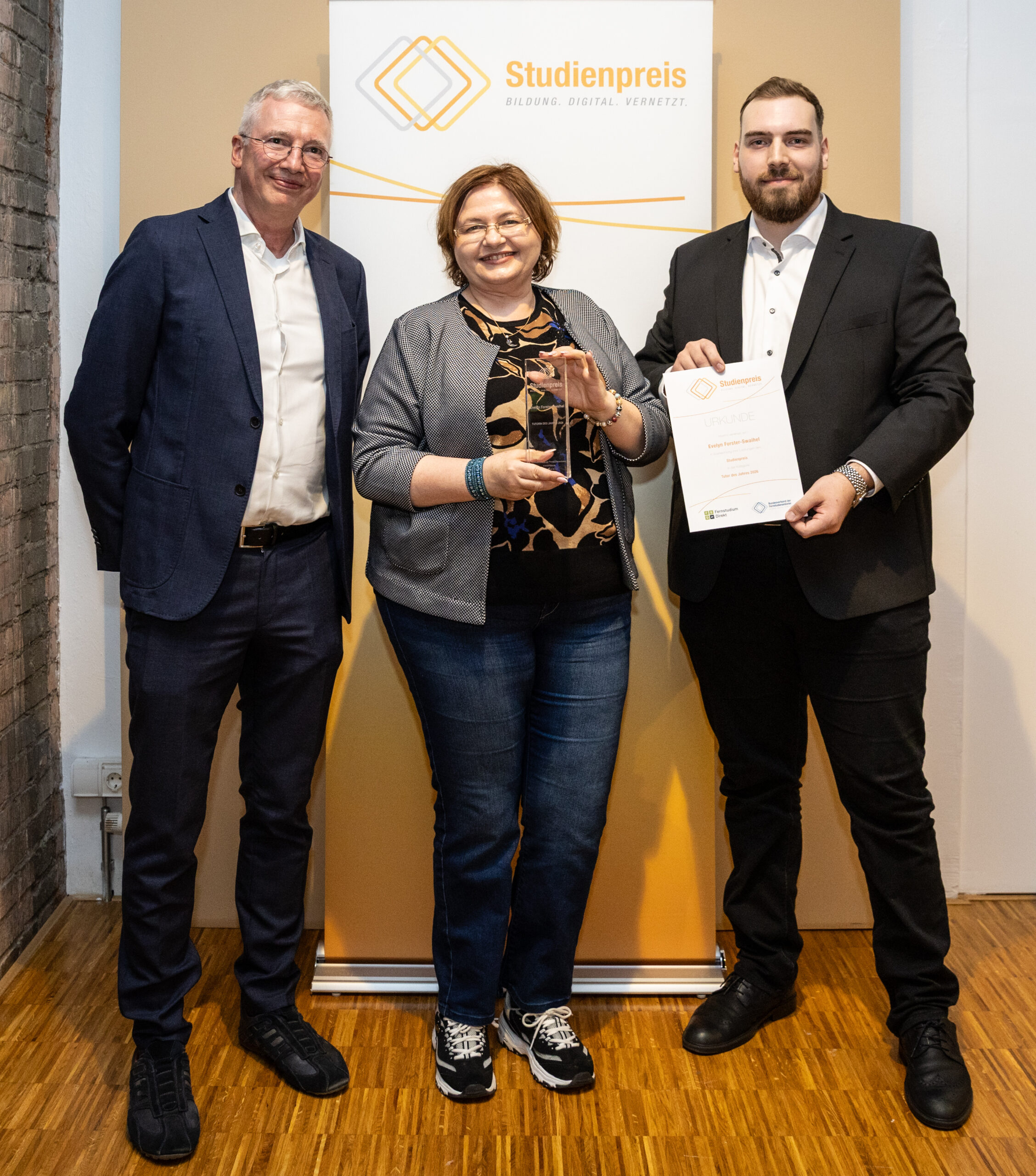 Auf dem Foto: Verbandspräsident Andreas Vollmer (li..) zusammen mit Preisträgerin Evelyn Forster-Swaihel und Jan Hölscher von Fernstudium Direkt.